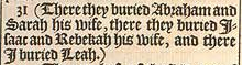 31 (Dort beerdigten sie Abraham und Sarah, sein Frau, dort beerdigten sie Isaac und Rebekka, seine Frau, und dort beerdigte ich Lea.)
