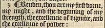 3 ¶ Reuben, thou art my first borne, my might, and the beginning of my strength, the excellencie of dignitie, and the excellencie of power: