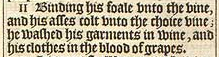 11 Binding his foale vnto the vine, and his asses colt vnto the choice vine; he washed his garments in wine, and his clothes in the blood of grapes.
