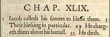 1 Jakob ruft seine Söhne, sie zu segnen. 3 Ihre Segnung im Einzelnen. 29 Er instruiert sie wegen seiner Beerdigung. 33 Er stirbt.