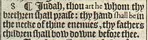 8 ¶ Iudah, thou art he whom thy brethren shall praise: thy hand shall be in the necke of thine enemies, thy fathers children shall bow downe before thee.
