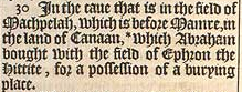 30 In der Höhe, die im Feld von Machpelah ist, das vor Mamre ist, im Land Kanaan, *welches Abraham mit dem Feld von Ephron dem Hetiter kaufte, als Besitz an einer Grabstelle.[*Genesis 23:16]
