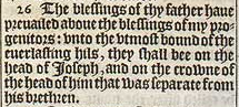 26 The blessings of thy father haue preuailed aboue the blessings of my progenitors: vnto the vtmost bound of the euerlasting hils, they shall bee on the head of Ioseph, and on the crowne of the head of him that was separate from his brethren.