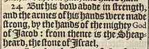 24 But his bow abode in strength, and the armes of his hands were made strong, by the hands of the mighty God of Iacob: from thence is the Sheapheard, the stone of Israel,
