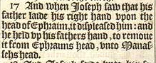 17 Und als Joseph sah, dass sein Vater seine rehcte Hand auf den Kopf von Ephraim legte, missfiel es ihm: Und er hielt seines Vaters Hand, sie von Ephraim zu entfernen zu Manasses Kopf.