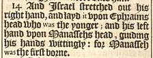 14 And Israel stretched out his right hand, and layd it vpon Ephraims head who was the yonger; and his left hand vpon Manassehs head, guiding his hands wittingly: for Manasseh was the first borne.