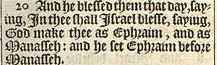 20 And he blessed them that day, saying, In thee shall Israel blesse, saying, God make thee as Ephraim, and as Manasseh: and he set Ephraim before Manasseh.