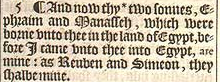 5 ¶ And now thy *two sonnes, Ephraim and Manasseh, which were borne vnto thee in the land of Egypt, before I came vnto thee into Egypt, are mine: as Reuben and Simeon, they shalbe mine. [ * Chap. 41. 50. iosh. 13.7. ]
