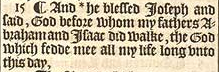 15 ¶ And *he blessed Ioseph and said, God before whom my fathers Abraham and Isaac did walke, the God which fedde mee all my life long vnto this day,[ *Hebr.11. 21. ]