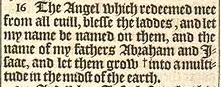 16 The Angel which redeemed mee from all euill, blesse the laddes, and let my name be named on them, and the name of my fathers Abraham and Isaac, and let them grow +into a multitude in the midst of the earth. [ + Hebr. as fishes doe increase.]