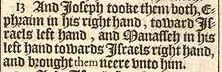 13 And Ioseph tooke them both, Ephraim in his right hand, toward Israels left hand, and Manasseh in his left hand towards Israels right hand, and brought them neere vnto him.