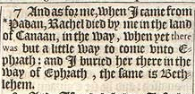 7 And as for me, when I came from *Padan, Rachel died by me in the land of Canaan, in the way, when yet there was but a little way to come vnto Ephrath: and I buried her there in the way of Ephrath, the same is Bethlehem. [ * Gen.35. 19. ]