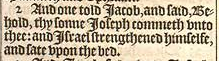 2 Und einer erzählte Jakob und sagte “Siehe, dein Sohn Joseph kommt zu dir”: Und Israel bestärkte sich selbst und setze sich auf das Bett.
