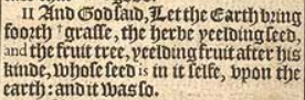 11 And God said, Let the Earth bring foorth +grasse, the herbe yeelding seed, and the fruit tree, yeelding fruit after his kinde, whose seed is in it selfe, vpon the earth: and it was so.[+Heb. tender grasse.]