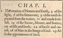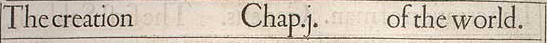 1 The creation of Heauen and Earth, 3 of the light, 6 of the firmament, 9 of the earth separated from the waters, 11 and made fruitfull, 14 of the Sunne, Moone, and Starres, 20 of fish and fowle, 24 of beasts and cattell, 26 of Man in the Image of God. 29 Also the appointment of food.