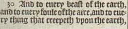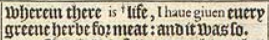 30 And to euery beast of the earth, and to euery foule of the aire, and to euery thing that creepeth vpon the earth, wherein there is +life, I haue giuen euery greene herbe for meat: and it was so.[+Hebr. a liuing soule.]