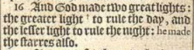 16 And God made two great lights: the greater light +to rule the day, and the lesser light to rule the night: he made the starres also.[+Hebr. for the rule of the day, &c.]