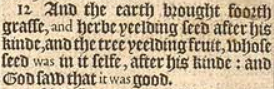 12 And the earth brought foorth grasse, and herbe yeelding seed after his kinde, and the tree yeelding fruit, whose seed was in it selfe, after his kinde: and God saw that it was good.