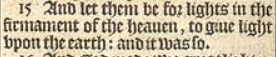 15 And let them be for lights in the firmament of the heauen, to giue light vpon the earth: and it was so.