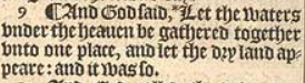 9 ¶ And God said, *Let the waters vnder the heauen be gathered together vnto one place, and let the dry land appeare: and it was so.[*Psal.33.7. and 136.5. iob.38.8.]