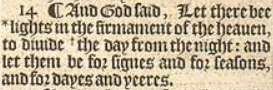 14 ¶ And God said, Let there bee * lights in the firmament of the heauen, to diuide +the day from the night: and let them be for signes and for seasons, and for dayes and yeeres.[*Deu.4.19 psal. 136.7. , +Hebr. betweene the day and betweene the night.]