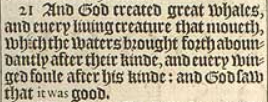 21 And God created great whales, and euery liuing creature that moueth, which the waters brought forth aboundantly after their kinde, and euery winged foule after his kinde: and God saw that it was good.