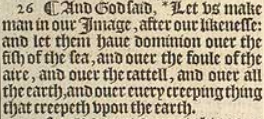 26 ¶ And God said, *Let vs make man in our Image, after our likenesse: and let them haue dominion ouer the fish of the sea, and ouer the foule of the aire, and ouer the cattell, and ouer all the earth, and ouer euery creeping thing that creepeth vpon the earth.[*Chap.5.1. and 9.6. 1.corin.11. 7. ephes.4. 14. col.3. 10.]