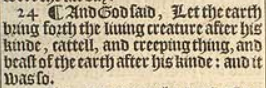 24 ¶ And God said, Let the earth bring forth the liuing creature after his kinde, cattell, and creeping thing, and beast of the earth after his kinde: and it was so.