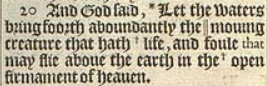 20 And God said, *Let the waters bring foorth aboundantly the ||mouing creature that hath +life, and foule that may flie aboue the earth in the +open firmament of heauen. [*4.Esdr.6. 47. , ||Or, creeping. , +Heb. soule. , +Heb. face of the firmament of heauen.]