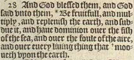 28 And God blessed them, and God said vnto them, *Be fruitfull, and multiply, and replenish the earth, and subdue it, and haue dominion ouer the fish of the sea, and ouer the foule of the aire, and ouer euery liuing thing that mooueth vpon the earth.[*Chap.9.1. , +Heb. creepeth.]