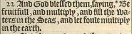22 And God blessed them, saying, *Be fruitfull, and multiply, and fill the waters in the Seas, and let foule multiply in the earth.[*Chap.8.17. and 9.1.]