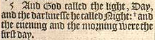5 And God called the light, Day, and the darknesse he called Night:+and the euening and the morning were the first day.[+Hebr. and the euening was, and the morning was &c.]
