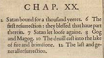 2 Satan gefangen für tausend Jahre. 6 Die erste Auferstehung: Die Gesegneten, die daran teilhaben. 7 Satan wieder freigelassen. 8 Gog und Magog. 10 Der Teufel wird in den See aus Feuer und Schwefel geworfen. 12 Die letzte und allgemeine Auferstehung.