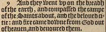 9 And they went vp on the breadth of the earth, and compassed the campe of the Saints about, and the beloued citie: and fire came downe from God out of heauen, and deuoured them.