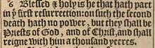 6 Blessed & holy is he that hath part in þe first resurrection: on such the second death hath no power, but they shall be Priests of God, and of Christ, and shall reigne with him a thousand yeeres.
