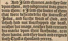 4 Und ich sah Throne und die auf ihnen saßen und über sie wurde Gericht gehalten: Und ich sah die Seelen derer, die für das Zeugnis Jesus und das Wort Gottes geköpft worden waren und die dem Biest nicht gehuldigt hatten noch sein Bild, noch ein Zeichen auf ihren Stirnen oder in ihren Händen erhalten hatten; und sie lebten und regierten mit Christus tausend Jahre.