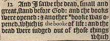 12 And I sawe the dead, small and great, stand before God: and the books were opened: & another *booke was opened, which is the booke of life: and the dead were iudged out of those things which were written in the books, according to their works. [*Chap.3.5.]