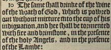 10 The same shall drinke of the wine of the wrath of God, which is powred out without mixture into the cup of his indignation, and hee shall be tormented with fire and brimstone, in the presence of the holy Angels, and in the presence of the Lambe: