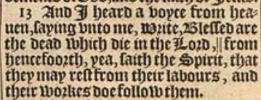 13 And I heard a voyce from heauen, saying vnto me, Write, Blessed are the dead which die in the Lord, ||from hencefoorth, yea, saith the Spirit, that they may rest from their labours, and their workes doe follow them.[||Or, from henceforth saith the Spirit, yea]