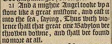 21 And a mightie Angel tooke vp a stone like a great milstone, and cast it into the sea, saying, Thus with violence shall that great citie Babylon bee throwen downe, and shall bee found no more at all.