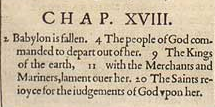 2 Babylon is fallen. 4 The people of God commanded to depart out of her. 9 The Kings of the earth, 11 with the Merchants and Mariners, lament ouer her. 20 The Saints reioyce for the iudgements of God vpon her.