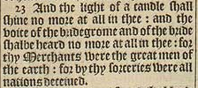 23 And the light of a candle shall shine no more at all in thee: and the voice of the bridegrome and of the bride shalbe heard no more at all in thee: for thy Merchants were the great men of the earth: for by thy sorceries were all nations deceiued.