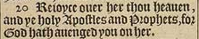 20 Reioyce ouer her thou heauen, and ye holy Apostles and Prophets, for God hath auenged you on her.