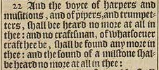 22 And the voyce of harpers and musitions, and of pipers, and trumpetters, shall bee heard no more at all in thee: and no craftsman, of whatsoeuer craft hee be, shall be found any more in thee: and the sound of a milstone shalbe heard no more at all in thee: