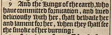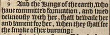 9 And the Kings of the earth, who haue committed fornication, and liued deliciously with her, shall bewaile her and lament for her, when they shall see the smoke of her burning: