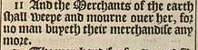 11 And the Merchants of the earth shall weepe and mourne ouer her, for no man buyeth their merchandise any more.