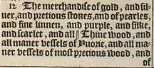 12 The merchandise of gold, and siluer, and pretious stones, and of pearles, and fine linnen, and purple, and silke, and scarlet, and all || Thine wood, and all maner vessels of Yuorie, and all maner vessels of most precious wood, and of brasse, and iron, and marble,[|| Or, sweet. ]