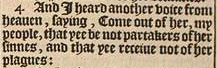 4 And I heard another voice from heauen, saying, Come out of her, my people, that yee be not partakers of her sinnes, and that yee receiue not of her plagues: