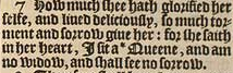 7 How much she hath glorified her selfe, and liued deliciously, so much torment and sorrow giue her: for she saith in her heart, I sit a *Queene, and am no widow, and shall see no sorrow.[ *Esay.47. 8.]