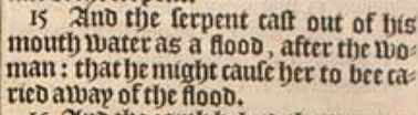 15 And the serpent cast out of his mouth water as a flood, after the woman: that he might cause her to bee caried away of the flood.